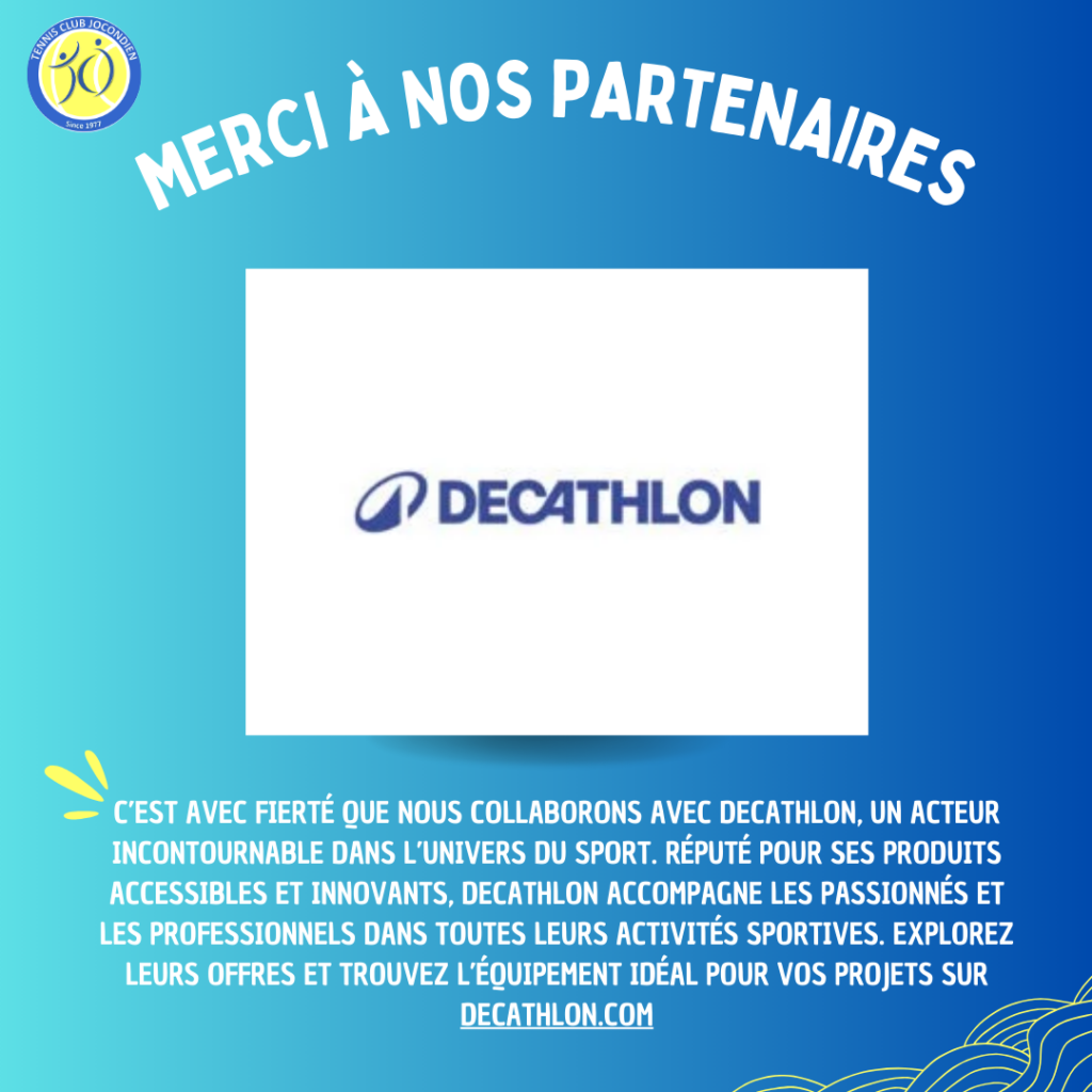 Jeu, set & Match Le Tennis Club Jocondien au service de tous les passionnés de Tennis depuis 1977 Réservez un court Nos prochainsEvenèments Plateau RougeMar 23, 2024 @ 14h00 - 17h000Comments Stages jeunes et adultesfévrier 17 @ 8h00 - février 21 @ 17h000Comments Stage jeunes et adultesfévrier 10 @ 8h00 - février 14 @ 17h000Comments Un club à l'adn de champions : Nos partenaires Nos terrains de tennis 4 courts intérieurs4 courts extérieursOuverts de 9h à 21h En savoir + Découvrez nos 2 salles de SquashElles sont : Ouvertes toute l’annéeDe 9h à 21h15Modernes En savoir + PLAY